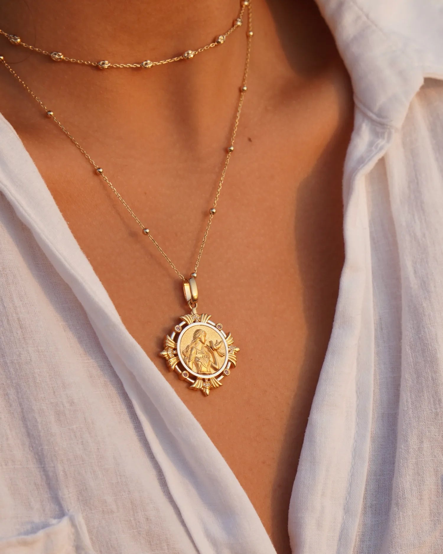 Each piece has special meaning. For example, the Hera Crown Necklace empowers women in marriage. Our jewelry protects various aspects of life and is paired with natural crystals to boost energy and courage.